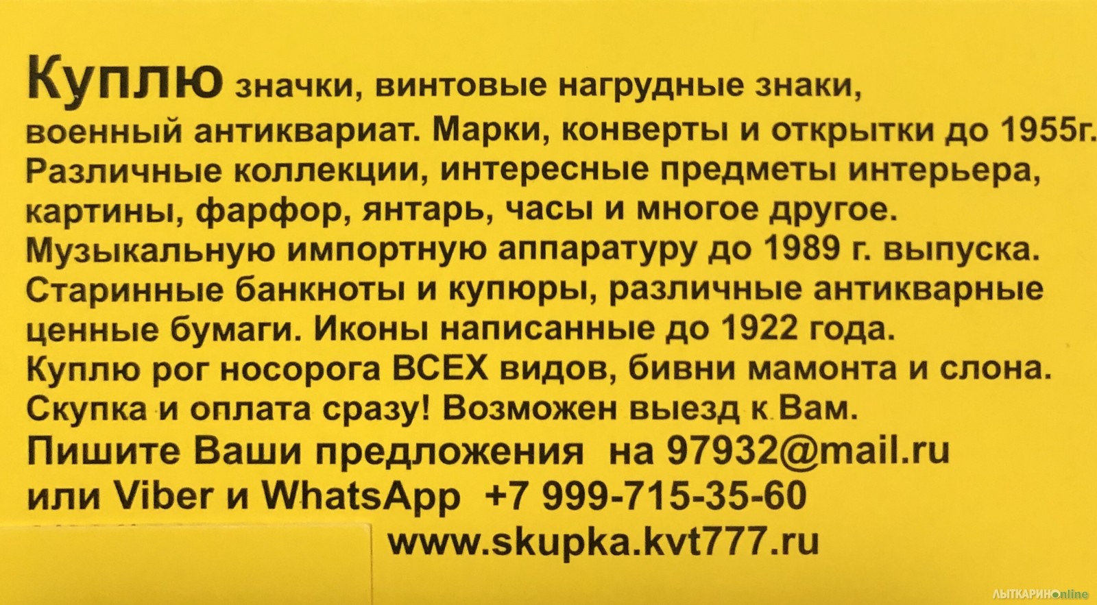 Куплю значки, винтовые нагрудные знаки, награды, военный антиквариат и атрибутику, книги. Марки, конверты и открытки до 1955года. Различные коллекции, интересные предметы интерьера, картины, фарфор, янтарь, часы. Старую музыкальную импортную аппаратуру до 1989г выпуска и многое другое. Иконы написанные до 1922года. Любые патефоны и граммофоны. Литые фигуры ( литьё ). Покупаем старинные банкноты и купюры, различные антикварные ценные бумаги и архивы. Куплю рог носорога ВСЕХ видов, бивни мамонта и слона. Старые Швейцарские франки 8 серия, бумажные английские фунты стерлингов, немецкие марки и банкноты некоторых других развитых стран которые нельзя обменять в банке! Скупка и оплата сразу! Возможен выезд к Вам. Если Вы хотите продать, то пишите Ваши предложения на почту 97932@mail.ru - Viber и WhatsApp -