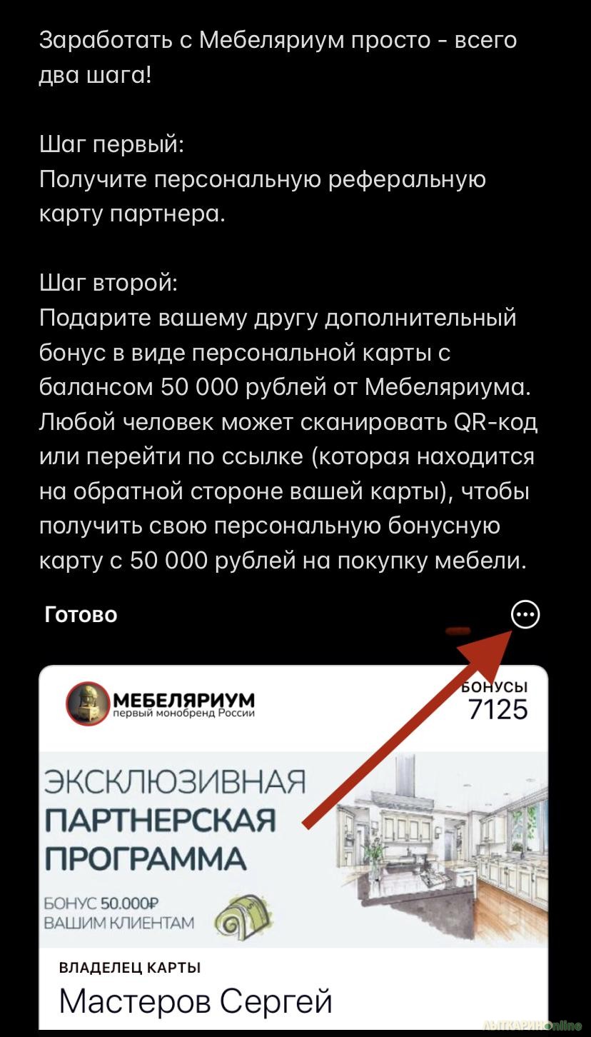 Шаг Второй Во время общения с клиентом дарите ему дополнительный бонус, в виде именной карты с балансом 50000 руб от своего партнера (компании Мебеляриум) на приобретение мебели. Клиент сканирует QR код с подарочного сертификата или рекламного баннера, и получает именную бонусную карту с балансом 50000 р Этот баланс дает возможность получить дополнительно, ко всем скидкам и акциям 5% скидку от стоимости заказа. Теперь, после обращения клиента в компанию «Мебеляриум» и приобретения любой мебели, Вы получаете 5% от стоимости договора на свою карту.