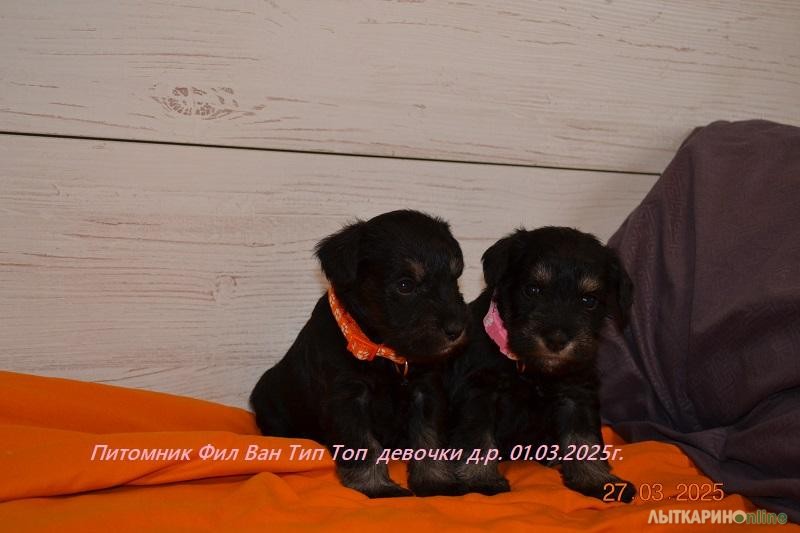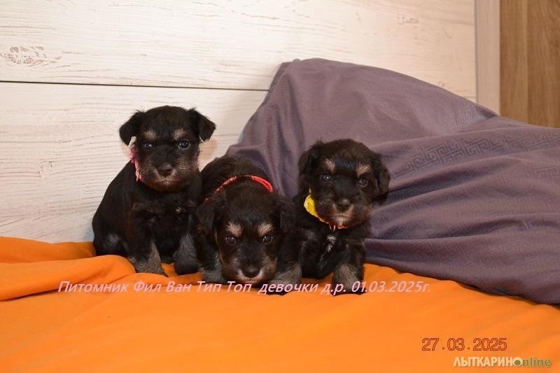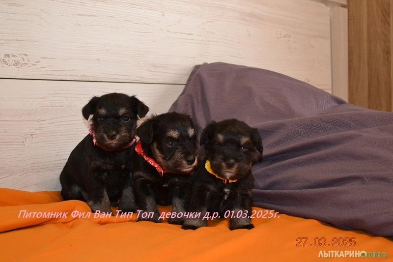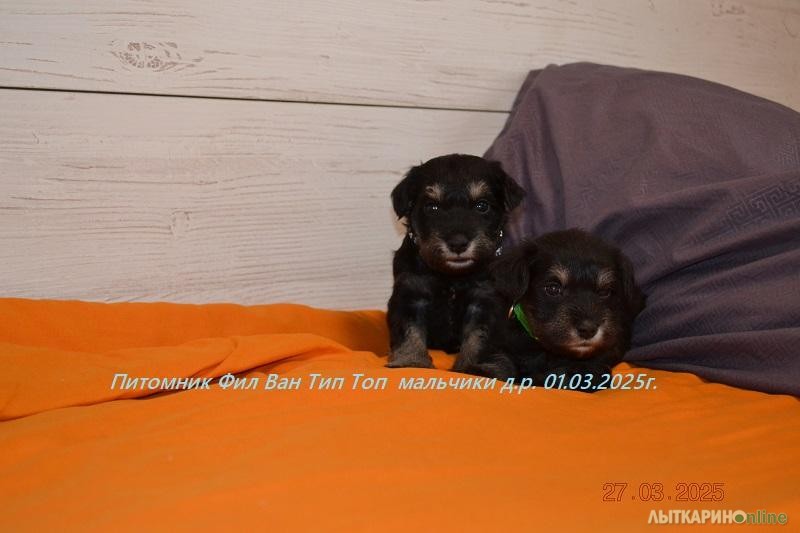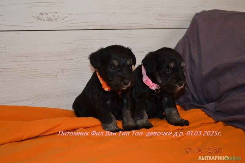 Питомник Фил Ван Тип Топ предлагает щенков цвергшнауцера, окрас черный с серебром. Очаровательные малыши родились 01.03.2025г. два мальчика и пять девочек. Мальчики черный и зеленый ошейник. девочки оранжевый, красный, желтый, темно розовый, светло розовый. Папа Санта Книрис Фарт Мама Фил Ван Тип Топ Гламурная Софья Родословную родителей можно посмотреть на сайте питомника. К переезду в новый дом, малыши будет полный пакет документов. Метрика РКФ, клеймо, ветеринарный паспорт, прививки по возрасту. Малыши приучены к пеленкам. Цвергшнауцер будет хорошем другом и охранником для вашей семьи, очень любят детей и с удовольствием будет играть с вашем ребёнком . Не агрессивны к животным и тем более - к людям, обладают крепким здоровьем, хорошим темпераментом, комфортным характером, хорошей концентрацией внимания, что позволяет добиваться успехов в дрессировке и спорте и на выставках. Наш питомник оказывает Всестороннею помощь, консультации, стрижки Тримминг.
