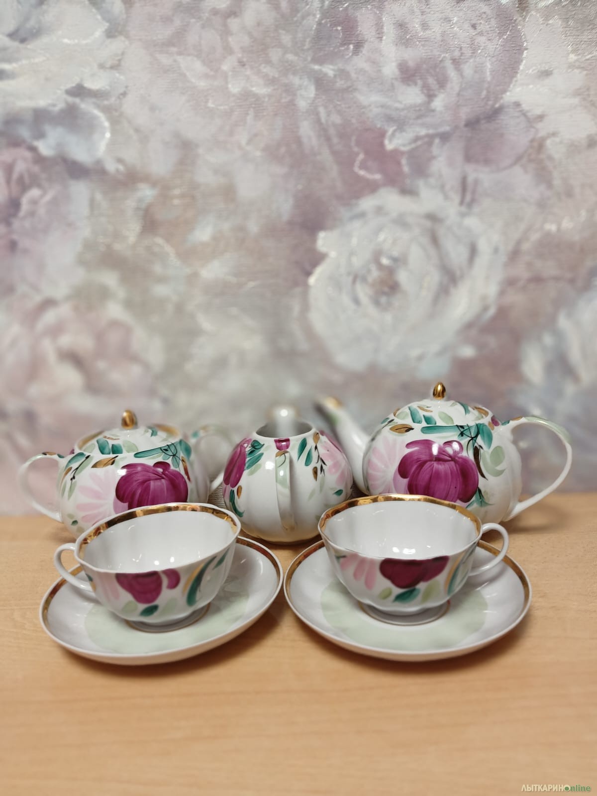 Продам чайный новый сервиз Пионы Дулёвского фарфорового завода. В сервиз входит 6 чашек, 6 блюдец, чайник, сахарница и молочник. Фарфор тонкостенный с золочением. Не использовался, стоял в серванте. Без сколов и трещин.