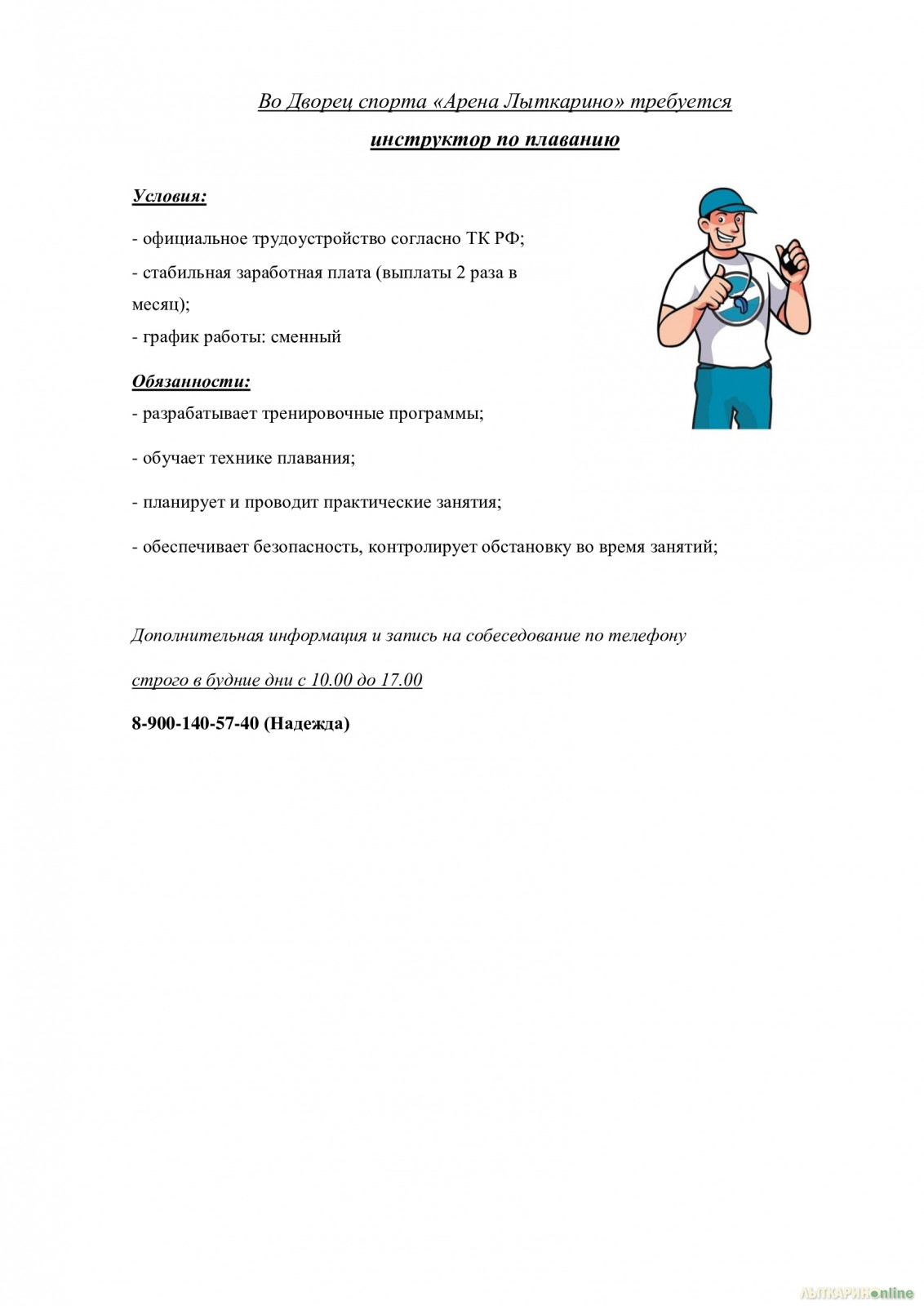 Место работы: Дворец спорта "Арена Лыткарино" Уровень заработной платы устанавливается по итогам собеседования.