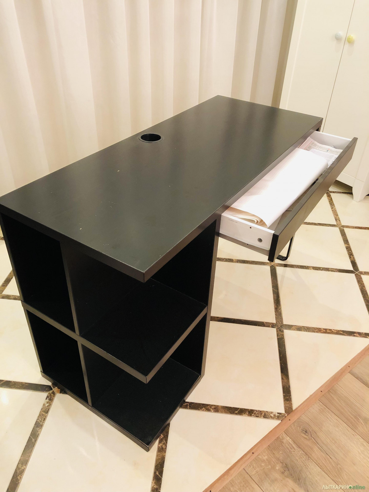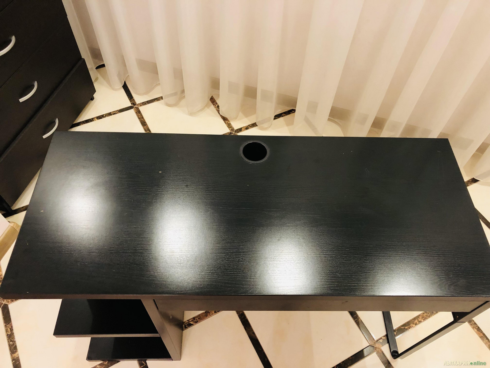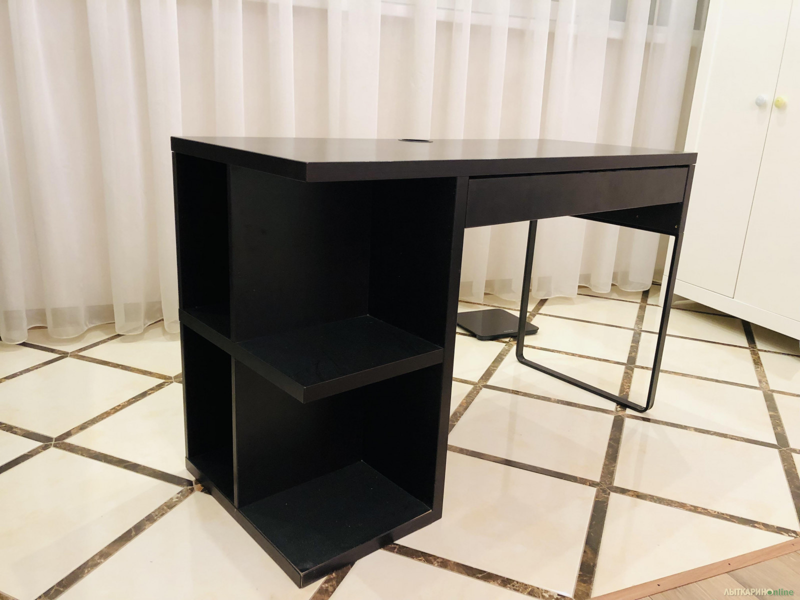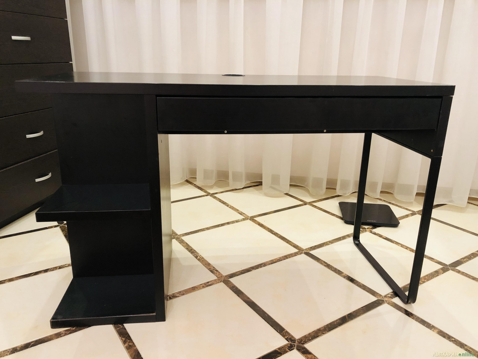 Рабочий стол б/у из дерева и металла, черный. Имеются полки и столешница. Ширина 120см, глубина 50см, высота 75см. Хорошее состояние.