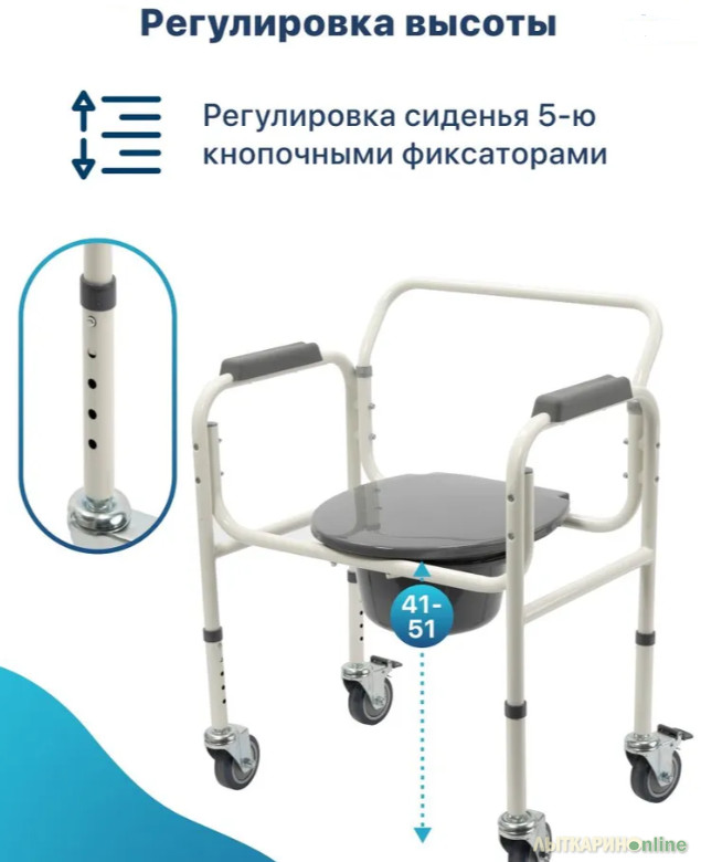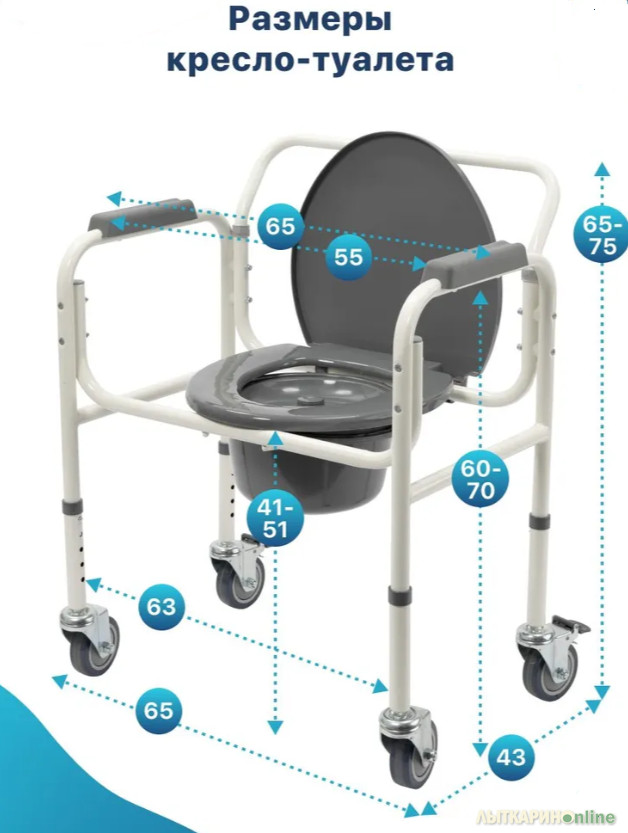 Продается НОВЫЙ В УПАКОВКЕ кресло-туалет с санитарным оснащением с колесами складной СМ Спутник — идеальный выбор для обеспечения комфорта и безопасности взрослых, пожилых людей и инвалидов. Этот санитарный стул является практичным решением для людей с ограниченной подвижностью, позволяя им самостоятельно справляться с личной гигиеной. Высота кресла -туалета регулируется, что делает его подходящим для пользователей разного роста и с различными потребностями. Благодаря своей функциональности это кресло станет незаменимым помощником в повседневной жизни. Ножки туалета для людей с ограниченными возможностями оборудованы самоориентирующимися колесами с тормозами, что позволит легко перемещать изделие. Кресло-туалет СМ Спутник обладает стальной конструкцией. Модель оснащена съемным ведром с крышкой и мягкими подлокотниками. Широкий кресло-туалет предназначен для людей с избыточным весом. Максимальная нагрузка, которую выдерживает кресло-туалет для инвалидов и пожилых, составляет 180 кг. Характеристики: Регулировка по высоте: 65-75 см, Максимальная нагрузка: 180 кг, Съемное ведро с крышкой, Материал: сталь, Тип рамы: разборная, Высота от пола до сиденья: 41-51 см, Расстояние между поручнями: 55 см, Диаметр колес: 10 см, Размеры: 65x43x65-75 см, Вес: 7 кг.