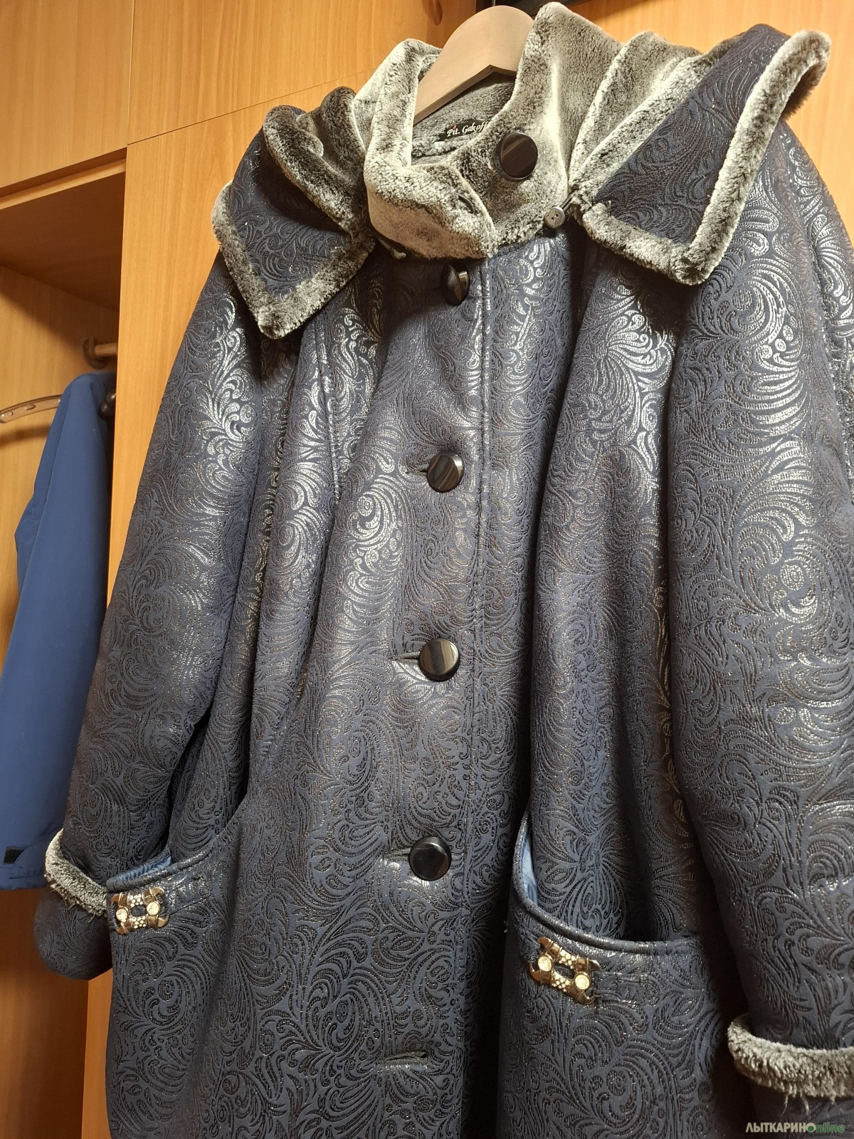 Дубленка в хорошем состоянии. Размер 66. Цвет темно-синий. Капюшон