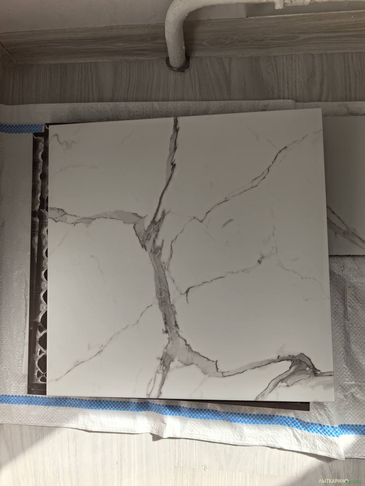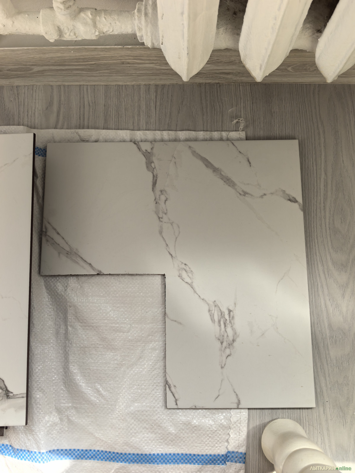 Продам новую напольную плитку керамогранит, которая осталась после ремонта. 8 плиток целых, 1 обрезана. На фото видно как выглядит плитка до уборки в санузле. Самовывоз из г. Лыткарино.