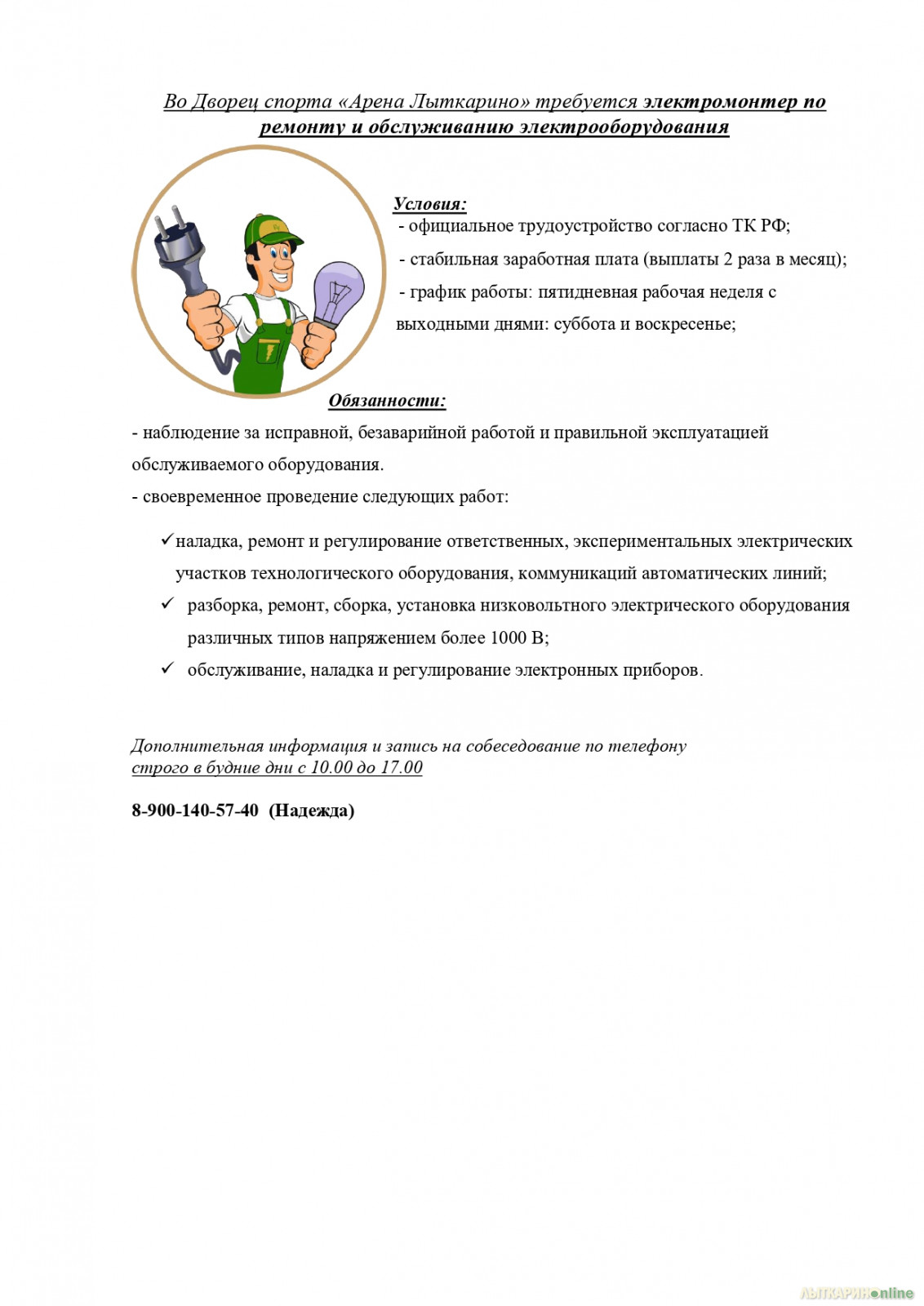 Уровень заработной платы устанавливается по итогам собеседования. Дополнительная информация и запись на собеседование по телефону строго в будние дни с 10.00 до 17.00
