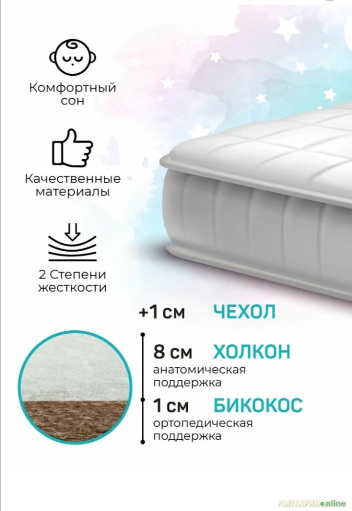 ✅Двухсторонний: 1-я сторона обладает умеренно-жёсткой жёсткостью 2-я сторона средняя жёсткость ✅Выполнен из гипоаллергенного материала,который не впитывает влагу и посторонние запахи ✅Имеет сьёмный чехол,который можно стирать в машинке ✅Максимальная нагрузка на спальное место-15 кг ✅Беспружинный!!!