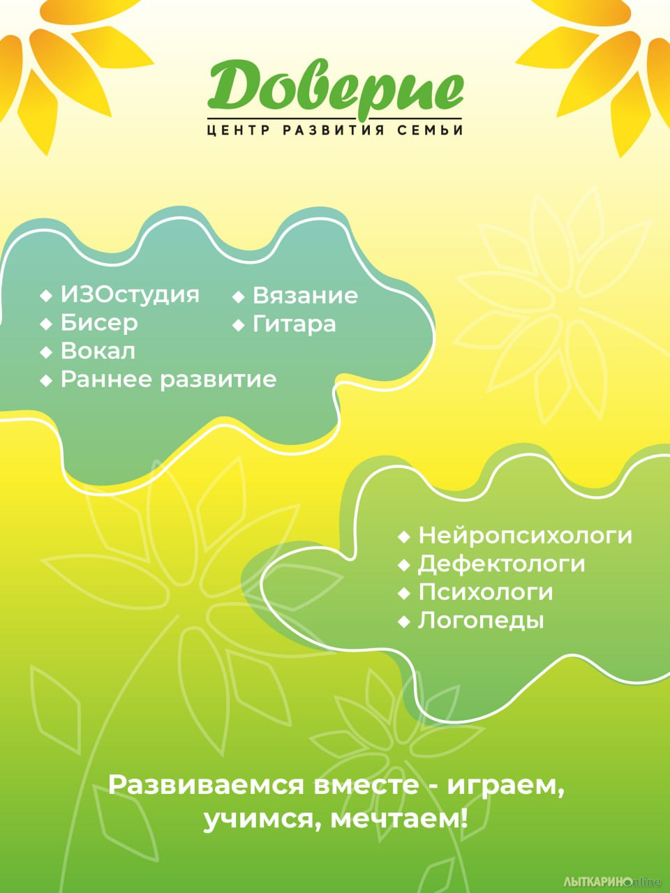 Кружок гитары, укулеле, эстрадный вокал для взрослых, вокал для детей (ансамбль «Чудо»), ВИА «Дети» (кружок раннего музыкального развития)